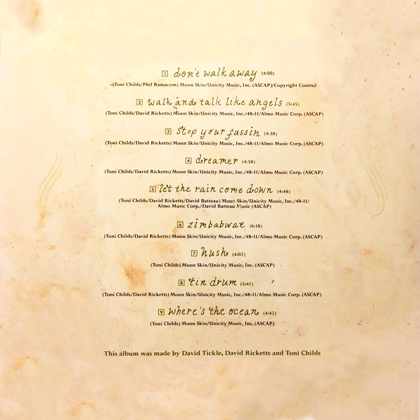 All songs written by Toni Childs and David Ricketts except as indicated.