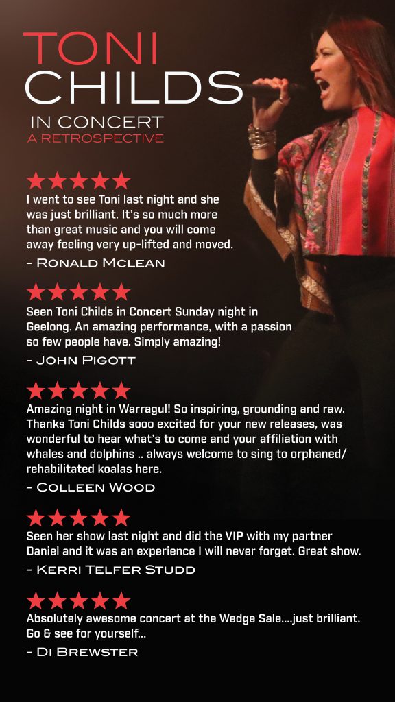Toni is offering an EXCLUSIVE VIP MEET & GREET PACKAGE. This exciting opportunity includes one concert ticket within the first row, a digital copy of Toni Childs Greatest Hits two CD set plus a drink backstage before the concert with Toni, at a special ticket price of $175. There is an allocation of 15 per show and this unique once in a lifetime experience can be purchased at the box office.
